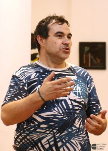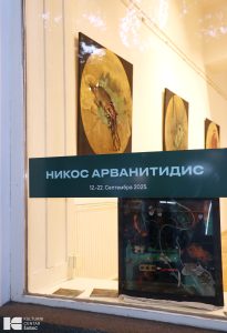 Графичар, професор, сликар Никос Арванитидис се први пут представља нашој, шабачкој публици. Озбиљан уметник, који се полако од графике и цртежа одмиче једном необичном изложбом која у себи има специфичну технику (е) и сасвим апстрактну причу коју баш није лако препознати и сублимирати. Очито је да Никос експрериментише, размишља, слика, лепи, користи разне материјале и ствара несвакидашњу ликовну причу. Претходни циклус је био циклус графика и цртежа под називом Урањање и онда један заокрет, и потпуно је другачији, једна прича која је сасвим комплексна, и као што сам прочитала у једном тексту ова изложба не фокусира на људско биће као мерило свега, већ га посматра као један део комплексне мреже односа који укључује животиње, биљке, машине, технологију и материју.